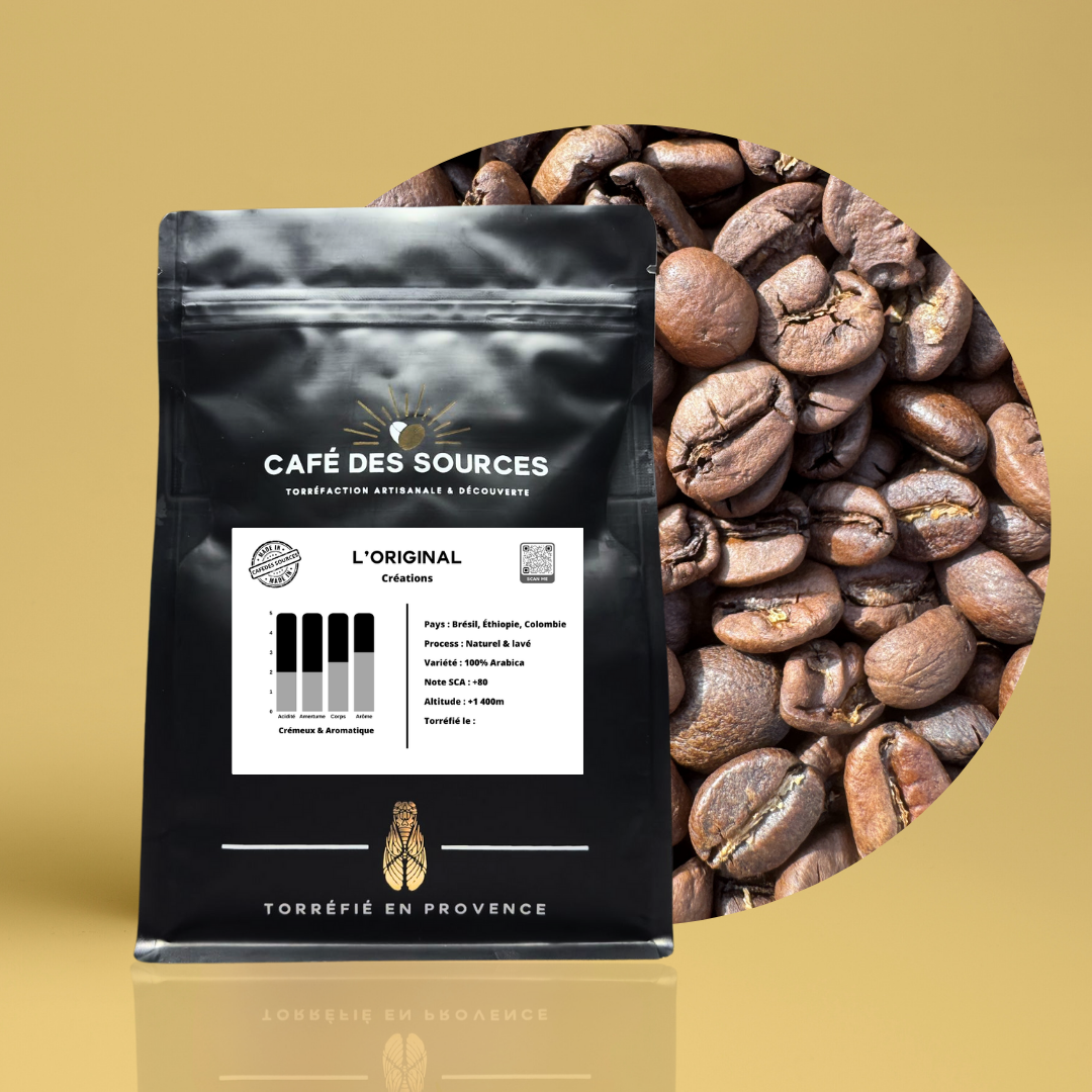 Découvrez notre Création: L'Original, ce café est un assemblage raffiné de grains 100% Arabica provenant du Brésil, de l’Éthiopie, et de la Colombie. Ce café révèle des arômes crémeux et intensément aromatiques, avec des nuances de cacao doux et un léger parfum floral. Sa texture soyeuse en fait une tasse délicate et équilibrée, idéale pour les amateurs de saveurs subtiles et élégantes.